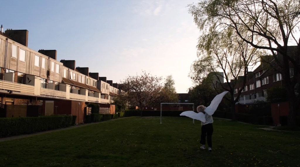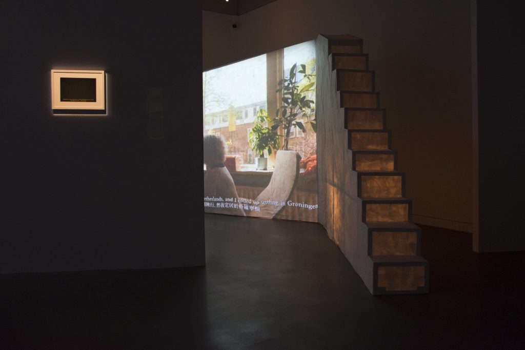 此件作品聚焦在遷移者搬遷至陌生國家的心理過程,試圖透過他們的身體記憶、對於家屋的空間感知及其經驗的敘述,呈現遷移者在移居過程中所經歷的語言揉雜、疏離及介於兩地之間的流離失所狀態。藝術家在旅居荷蘭的期間曾訪問幾位遷移者,他們的身體像是從未落地般地持續懸置在移居的過程中,藝術家從情感及感知層面切入遷徙議題,希望藉由他們的感性經驗,描繪介於兩地之間混沌且龐雜的狀態。